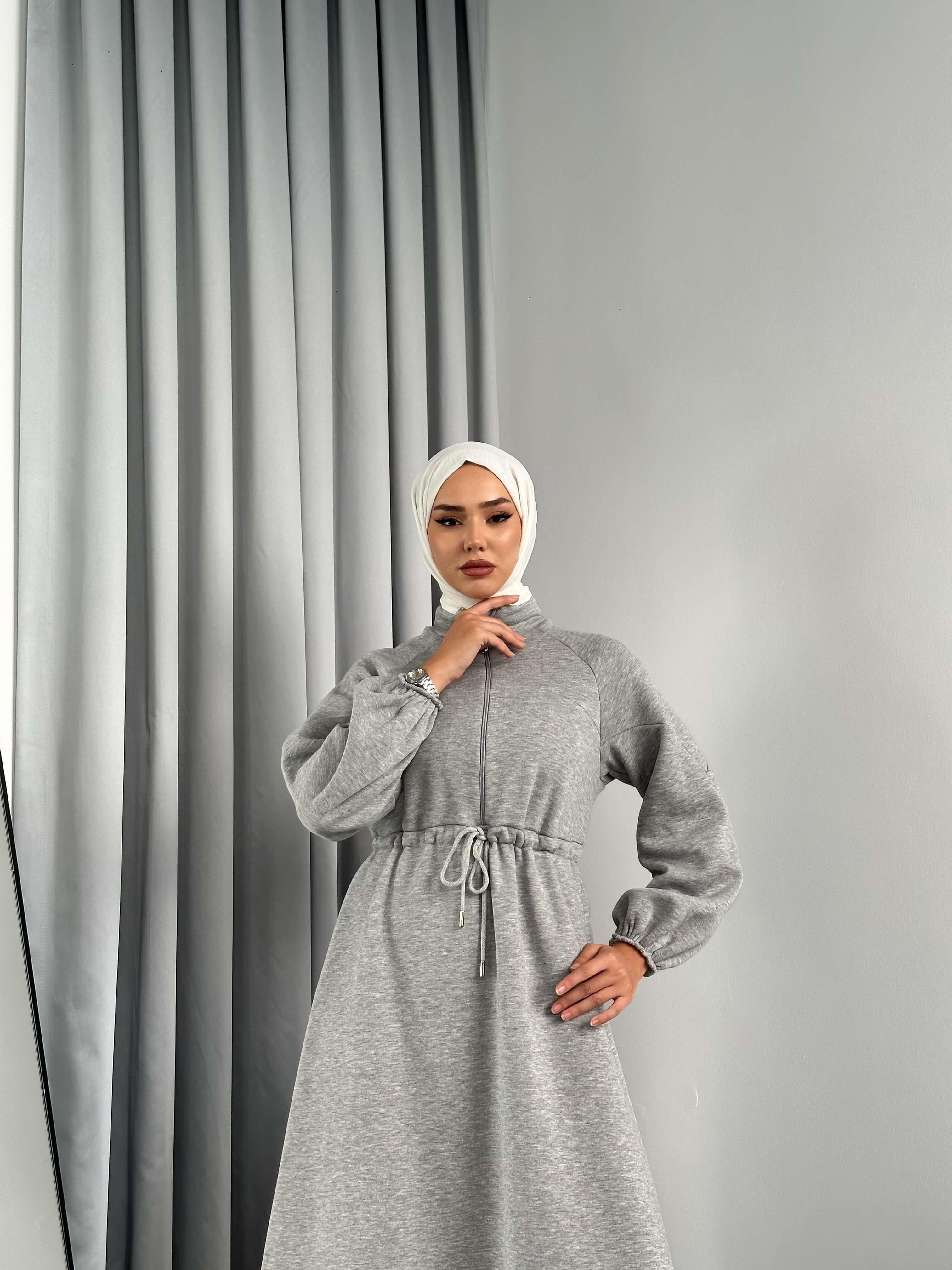 Belden Bağcıklı 3 İplik Şardon Elbise Gri